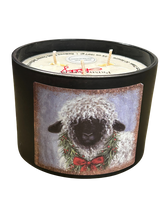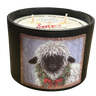 A jar candle from our Christmas Collection displaying a double-sided design of a sheep wearing a Christmas wreath on frosted black glass. Design is replicated from original artwork painted onto burlap canvas, giving the art a unique depth and texture. Seasonal candle features soy-based wax and 3 fabric wicks with 30 hours of burn time activating a calming Cinnamon scent. Our Christmas Sheep jar candle includes a dust cover and plastic lid for protection and polished appearance. A Christmas-themed home accent that is great for gifting.