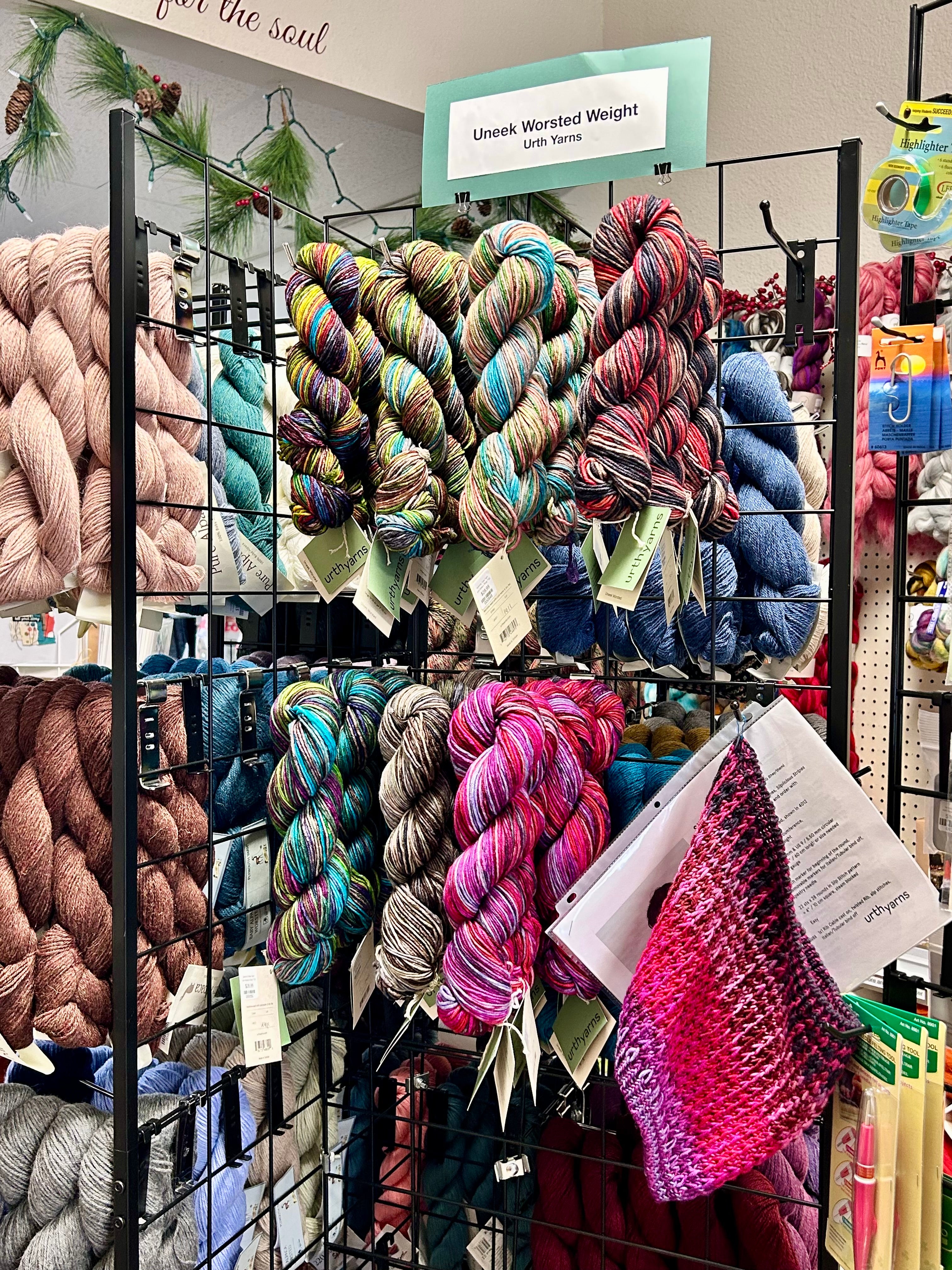 We carry beautiful local yarns, alpaca blends, and hand-dyed options that are perfect for these projects, and we’re happy to help you find the right fit for your yarn.