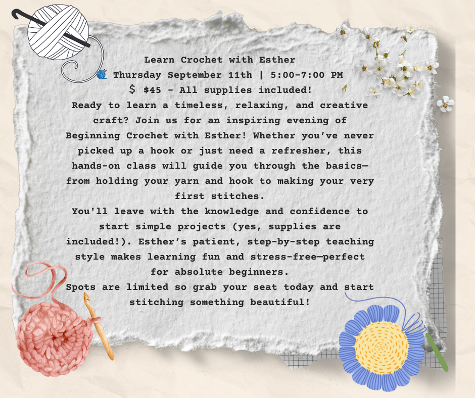 Ready to learn a timeless, relaxing, and creative craft? Join us for an inspiring evening of Beginning Crochet with Esther! Whether you’ve never picked up a hook or just need a refresher, this hands-on class will guide you through the basics—from holding your yarn and hook to making your very first stitches.