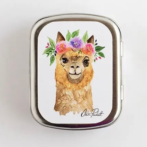 Your tin will come bedecked with a sticker bearing our exclusive watercolor alpaca hand painted by our lead designer Dawn Prickett.