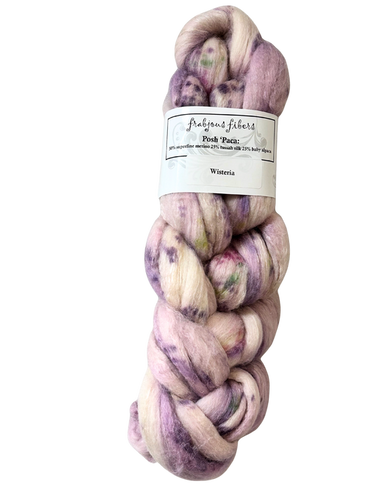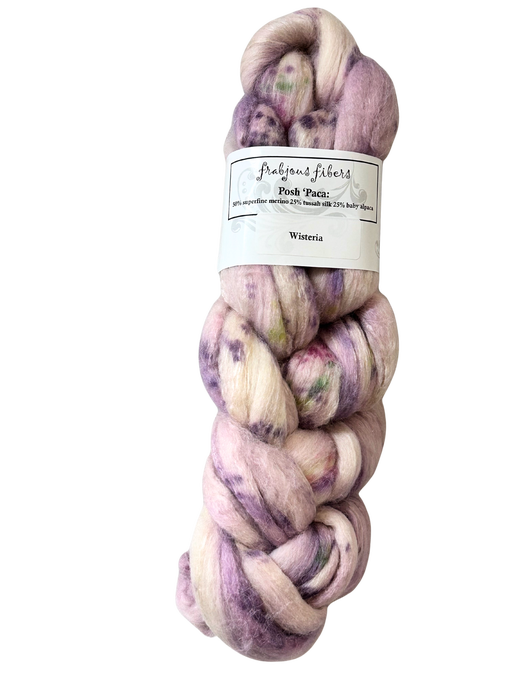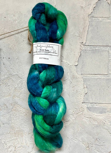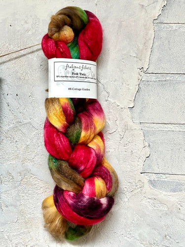 About our fibers: We take extra care to create fibers tat are a dream to spin. We start with high-quality wool top-this one is a blend of some of the finest fibers: superfine merino, silk, and baby alpaca. The fibers are dyed using a special method that allows the colors to blend and shift, creating a complex colorway. Each batch is heated slowly and handled gently to avoid felting. This careful processing leaves a fluffy, soft, easily draft-able wool that will spin into a lovely yearn.