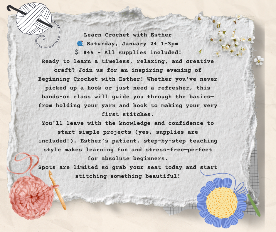 Ready to learn a timeless, relaxing, and creative craft? Join us for an inspiring evening of Beginning Crochet with Esther! Whether you’ve never picked up a hook or just need a refresher, this hands-on class will guide you through the basics—from holding your yarn and hook to making your very first stitches.